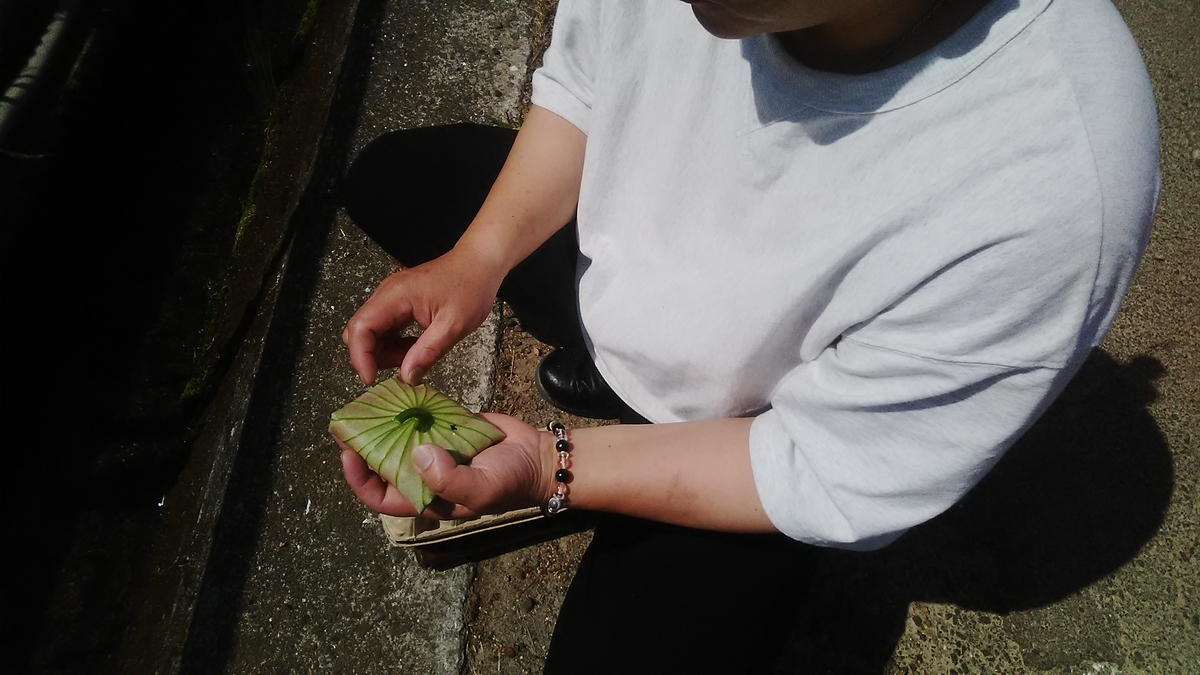 こうやってレンコンの葉を包むのだと教えてもらいました、、、