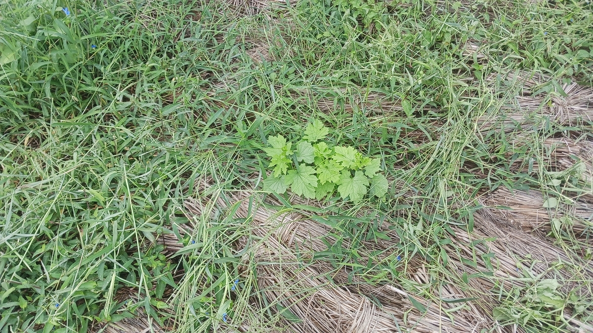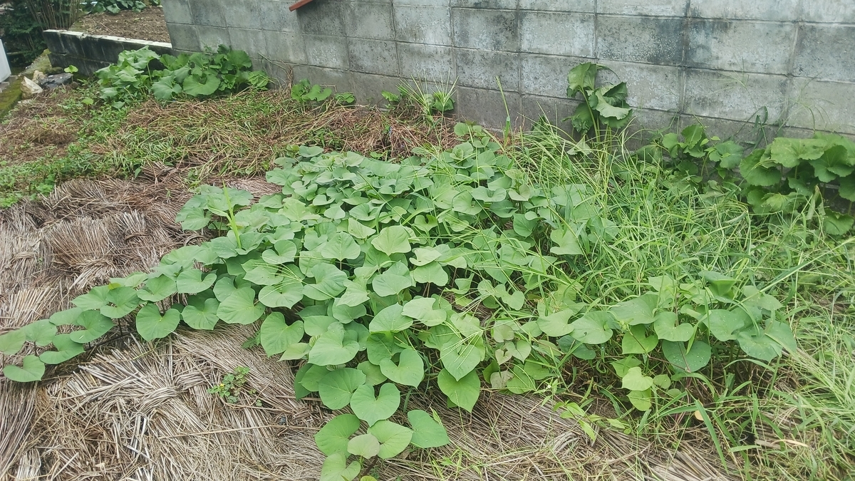 稲わらを厚く敷いたところからは草が生えていない、、、